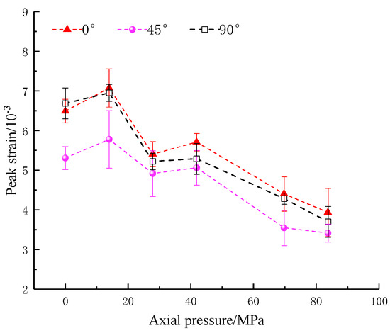 - The peak strain and dynamic modulus of elasticity, affected by the weakening of the inclination angle, are similar to the strength. The peak strain shows an overall trend that increases and then decreases with the increase in axial pressure. The inflection point of the trend occurs at an axial pressure of 27.9 MPa (20% UCS). The overall axial pressure at 0~50% UCS increases step by step.