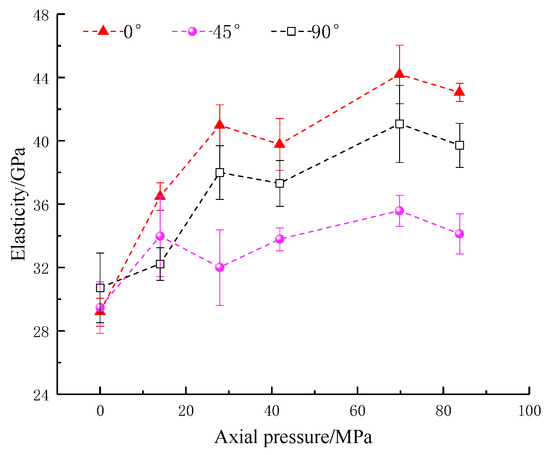 The strain and modulus of elasticity are important indicators of the deformation characteristics of the rocks. The relationship between peak strain, dynamic modulus of elasticity and axial pressure is shown in Figure 8 and Figure 9. It can be seen that the weakening of the peak strain and dynamic elastic modulus by the inclination angle is similar to that of the strength; both of them first decrease and then increase with the increases in the crack angle. The peak strain shows an overall increasing trend and then a decreasing trend as the applied axial static pressure increases. The reason for its stepwise decrease is that the increase in the axial pressure reduces the remaining deformation of the rock. At the axial pressure of 27.9 MPa (20% UCS), the dynamic modulus of elasticity at different fracture inclinations of the precast specimens shows an increase with axial static pressure. At axial pressures of 0~69.8 MPa (0~50% UCS), the overall trend increases step by step, with inflection points at 27.9 MPa (20% UCS) and 41.9 MPa (30% UCS) and a decreasing trend at 69.8–83.8 MPa (50–60% UCS). The reason for the rise in the dynamic modulus of elasticity is similar to that of the combined strength and is related to the compression-density effect of the axial pressure. The decrease at high axial pressures (50–60% UCS), on the other hand, is due to the larger loads making the rock enter an earlier state of damage, weakening its effective load-bearing capacity in the dynamic impact loading and leading to a decrease in the dynamic modulus of elasticity. In this process, the above-mentioned information indices produced a significant turnaround in the trend at axial pressures of 27.9 MPa (20% UCS) and 41.9 MPa (30% UCS). Therefore, the measurement indices of the parallel double fracture specimens at 20–30% static axial pressures should be noted.