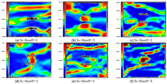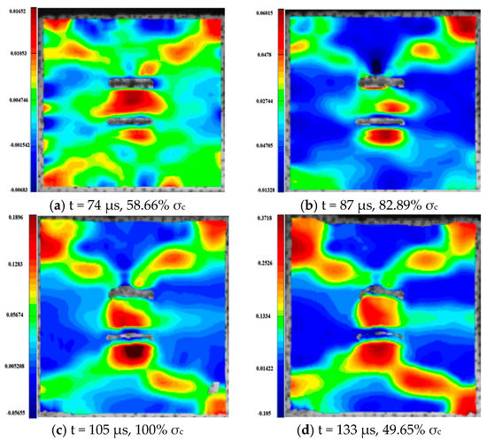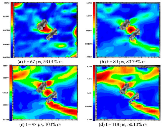 The fracture of rock contains the process of crack initiation, propagation and coalescence. The damage evolution process is very complex and has very important engineering significance. Through DIC technology, the stress field variation characteristics of fractured rock after failure under dynamic and combined loadings were analyzed [46,47]. The maximum principal strains of 0° specimens under different axial pressures are given in Figure 28, where representative strains from each group were selected for analysis. As can be seen from the figures, the damage patterns of the 0° inclined specimens under different axial pressures are still very different. Under a combined, dynamic and static loading of 0% UCS, the granite with parallel double fissures breaks with three TSZ running through the two flaws of the specimen. The uppermost TSZ shows a significant increase in tensile strain values, eventually presenting significant tensile damage.