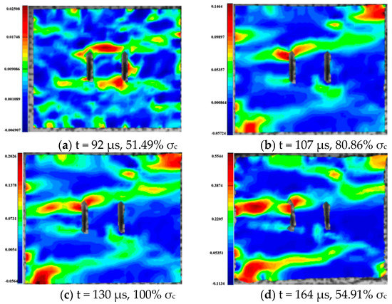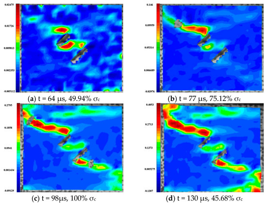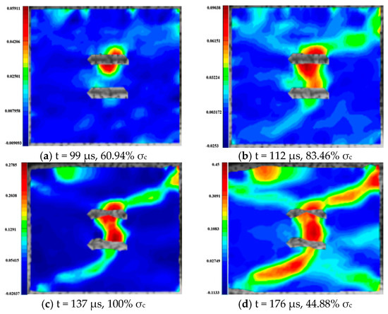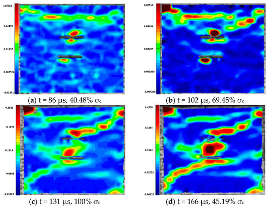 For the rock specimens with 0° bi-flaws, the stress field and crack propagation mode gradually change under the loading of static pressure of 30% UCS. We selected four typical stress fields in the loading process and analyzed their changes, as shown in Figure 16. Figure 17b reveals that the upper flaw penetrates the upper right corner to form a shear strain crack, generating a larger TSZ in the middle. The lower part of the lower flaw begins to develop a lower strain, and partial shear damage develops, as shown in Figure 17c. In Figure 17d, two shear cracks extend to the diagonal, connecting the ends of the flaws, which eventually cause damage to the rock.