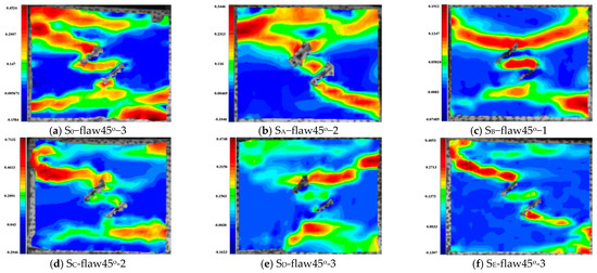 For the rock specimens with 45° bi-flaws, the stress field and crack propagation mode gradually change under the loading of a static pressure of 60% UCS. We selected four typical stress fields in the loading process and analyzed their changes, as shown in Figure 24. From Figure 25a, it can be seen that a large TSZ is formed in the bridge area of the parallel bi-flaws. At the upper end of the upper flaw, a TSZ is formed in the anticlinal direction. Figure 25b shows that the anticlinal strain zone continues to develop along the diagonal, forming a smaller strain zone in the upper flaw along the fracture direction and in the lower part of the lower flaw. In Figure 25c, the end of the flaw is destroyed, and the shear strain propagates through the specimen along the loading direction. The main shear crack and a horizontal TSZ in the upper part are formed, which eventually lead to the shear damage, as shown in Figure 25d.