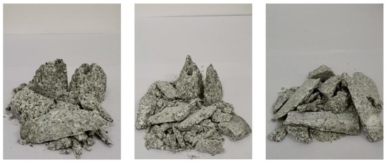 The fractural dimension of rock specimens could directly and quantitatively reflect the degree of rock fracture [48]. The larger the dimension of the specimen, the more fragments; the smaller the volume, and the higher the degree of fragmentation. In order to analyze the fractural characteristics, the pieces were collected for sieving after the impact was completed (Figure 31). In order to quantitatively analyze the failure state under different conditions, the fractural dimensions were calculated, and the relationship between the fractural dimension and the strain rate, the axial pressure and the fissure angle were discussed. It can be seen from Figure 32a that the fractural dimension increased with the increase in the strain rate, which showed a good linear correlation. In the test, the granite strain rate increased from 73.93 s−1 to 164.08 s−1, and the fractural dimension increased from 1.5963 to 2.8014. As shown in Figure 32b, the fractural dimension is closely related to the fissure angle. The fractural dimension showed the change law of decreasing and then increasing. When the angle is 90°, the dimension is the smallest, and at 45°, it reaches the maximum. Figure 32c showed that the fractural dimension first decreased and then increased with the increase in axial pressure, but it is slightly higher when the axial pressure is 0% UCS, which is opposite to the dynamic strength, which illustrates that in engineering practices, bridge angle and fractural dimension affect the rock fragmentation degree. Therefore, appropriately increasing the angle of the excavation fissure and reasonably utilizing the natural in situ stress will help to improve the efficiency of rock excavation and rock breakage to some extent.