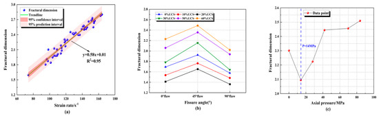 The correlation between fractural dimension and (a) strain rate, (b) fissure angle and (c) axial pressure.