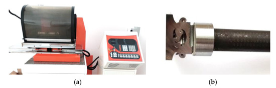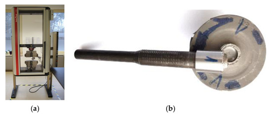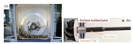 The static tensile test of the welded joints were carried out on a Zwick/Roell Z100 machine (Zwick Roell Group, Ulm, Germany). Figure 6a,b shows the test stand for testing the tensile strength of the friction-welded elements and the turbine rotor, respectively.