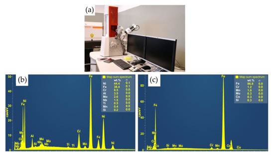 Scanning electron microscope and spectral analysis of the materials: (a) measuring stand; (b) spectra of the Inconel 713C and (c) spectra of the 32CrMo4 steel.