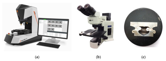 (a) hardness tester (Qness 60M); (b) optical microscope (Olympus BX51M); (c) the positioned specimen.