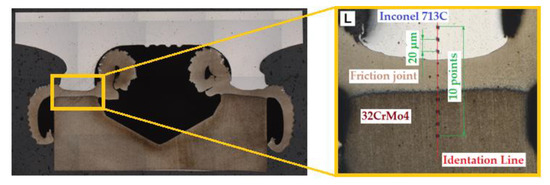 After the cut samples were positioned in epoxy resin (Figure 7c), each sample was polished using discs with a grain size of 120 to 2500 and then polished with a diamond paste (grain size 3 μm and 1 μm). In order to reveal the microstructure, the samples were etched with the Mi-19 Fe reagent (chemical composition: 3 g FeCl3, 20 g HCl, 90 mL C2H5OH). The joint hardness test was carried out on the samples before the etching stage. Figure 9 shows a diagram of the measurement points for the microhardness of the friction-welded joints. For each joint, the hardness was measured at ten points. Three measurement points were located in Inconel 713C, three points in the obtained weld, and the remaining four in the 32CrMo4 material. The test sample and the locations where the joint microstructure was analysed are shown in Figure 10.