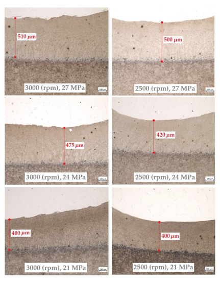 The average values of hardness for the BM were found to be 420 HV0.5 for Inconel 713C and 360 HV0.5 for 32CrMo4 steel. The hardness values obtained, as shown in Figure 10, were carried out at 0.2 mm intervals. Differences in hardness in the heat-affected zone and base metal were also observed. The hardness distribution of the specimens is presented in Figure 11. It can be seen that the hardness decreases in the thermo-mechanically affected zone from Inconel 713C to 32CrMo4. The hardness of the partially deformed steel zone increases with increasing friction pressure.