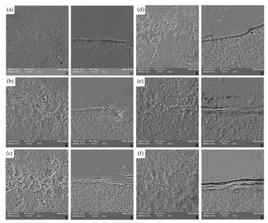 For RFWed joints, it is most desirable that the HAZ has an even distribution (same width) along the resultant friction weld. The HAZ zone, where the temperature was lower, is characterised by strongly bent bands in the radial direction. For example, in Figure 19b, the difference in the topography of the structure near the welded joint can be seen. The friction welding process did not cause a loss of the structure’s banding but a change in the arrangement of the bands from vertical and diagonal to horizontal (radial). In addition, the horizontal bands are disturbed by lines that are most likely grain boundaries. The coniferous character of the base material was completely lost in the weld zone. In the friction-welded joints, it is not possible to isolate the interface. The weld shows a homogeneous, spongy microstructure. Regardless of the nature of changes in the observed microstructure, the heat generated in the RFW process resulted in softening of the material. In the HAZ zone, the hardness decreased on average by approximately 80 HV0.5. However, the HAZ zone has a more homogeneous microstructure than the base material.