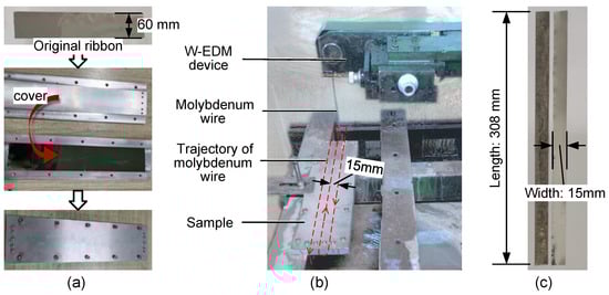 The ribbons were cut into samples with 308 × 15 mm dimensions for the experiments. In the process of sample preparation, the aluminium tooling shown in Figure 1a was used to clamp a single ribbon for W-EDM cutting to overcome the problem of the ribbons being too thin. The W-EDM equipment and trajectory of the molybdenum wire are shown in Figure 1b. The pulse EDM width was 50 s, and the current was 2 A. Finally, The samples were annealed at 390 °C for 96 min to remove residual stresses caused by machining. The prepared samples are shown in Figure 1c.