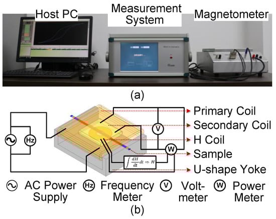 The monolithic AA magnetic tester system, TD8160(TUNKIA, Changsha, China), with ±2% nominal error, was used for magnetic measurement of the prepared samples, which is shown in Figure 2a. The magnetometer consists of a U-shape high magnetic permeability yoke, primary coil, secondary coil and H-coil [27]. The composition of each component of the magnetometer and its connection with the measurement system is shown in Figure 2b. Furthermore, the prepared AA samples were inserted between two coils to complete the magnetic test. Core losses of the AA samples and original ribbons were evaluated under sinusoidal wave forms with frequency of 50, 100, 200, and 400 Hz and magnetic flux densities from 0.1 to 1.5 T.