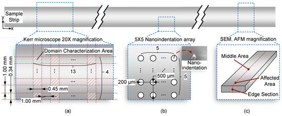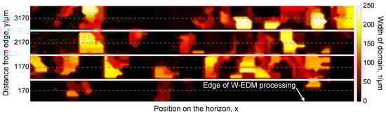 The above experimental results show that the domain width distribution contour, in Figure 10, hardness and elastic modulus, in Figure 11, all show regular changes with the distance from the W-EDM-processed edge. The region within 1 mm from the W-EDM-processed edge exhibits the properties of narrow domain width, low hardness, and modulus. However, the area beyond 1 mm from the processed edge, all parameters are close to those of the original ribbon.