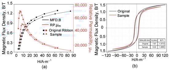 Furthermore, its magnetic permeability also significantly deteriorated. As shown in Figure 5a, the peak relative permeability of the W-EDM-processed sample was about 72.8% of the original ribbon. According to Equation (1) [30], under the conditions of the same peak magnetic flux density, the decrease in the magnetic permeability leads to an increase in the core loss of the material.