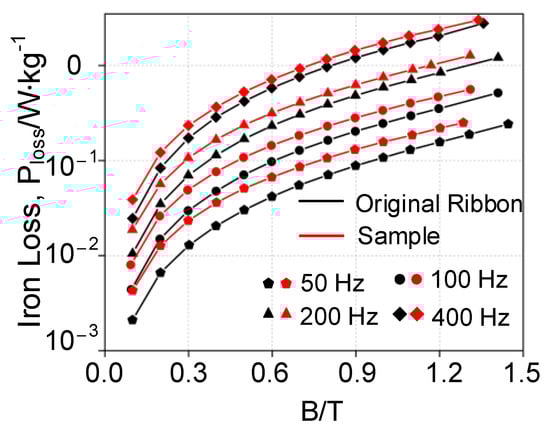 The core loss of the AA samples at different frequencies is shown in Figure 6, in which the loss of the W-EDM-processed sample was significantly higher than the original ribbon. Taking the condition of 1.2 T and 400 Hz as an example, the W-EDM process increases the core loss of the ribbon by around 1.2 times.