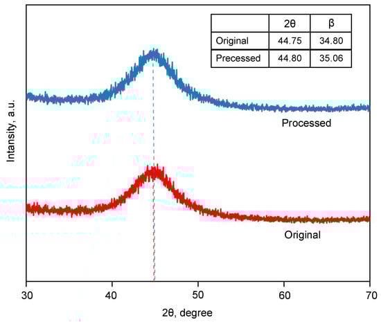 The XRD patterns of the original and processed AA ribbons are shown in Figure 7. The XRD pattern of the samples before and after W-EDM all show a diffuse diffraction peak at . The values of the full width at half maximum () have little differences. The results show that the W-EDM-processed sample has no obvious crystallization behaviour and still had a high content of the amorphous phase.