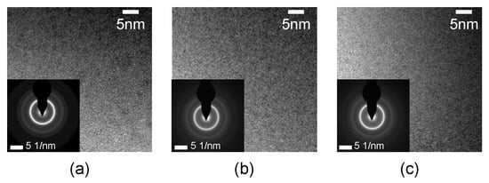 Figure 8 shows the TEM results of the AA ribbon before and after W-EDM processing, which includes the high-resolution transmission electron microscopy (HRTEM) images and selected area electron diffraction (SAED) patterns in the lower-left corner. The original ribbon, centre area, and edge area of the processed sample were characterized by TEM separately, as shown in Figure 8a–c. The HRTEM images of the three all show an almost completely disordered structure. Furthermore, the corresponding SAED patterns also show diffuse diffraction rings. The above phenomena all meet the typical amorphous structure.