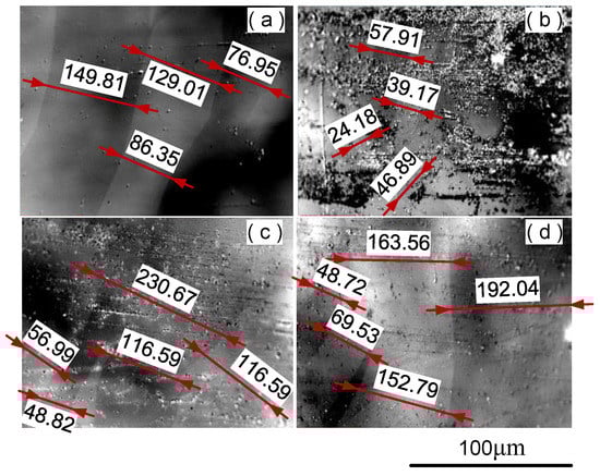 According to the domain characterization scheme proposed in Section 2.3, a total of 52 magnetic domain images were photographed. The characteristics of typical magnetic domains at different horizontal positions are shown in Figure 9. The magnetic domain of the original ribbon is shown in Figure 9a, which presents a wide and regular stripe pattern. It shows that the original ribbon has a uniform structure, low-stress state, and good soft magnetic properties. After W-EDM processing, the samples have irregular domain shapes. Figure 9b–d show typical domain patterns at 0, 1, and 3 mm from the edge, respectively. It can be seen that the magnetic domain width at the edge of the processed sample is narrow, and the number of domain walls increases significantly. However, at 3 mm from the cutting edge, a wide and regular magnetic domain state similar to that of the original ribbon appears again. It was found that the proportion of wide magnetic domains increases with the increasing distance from the edge of W-EDM processing.