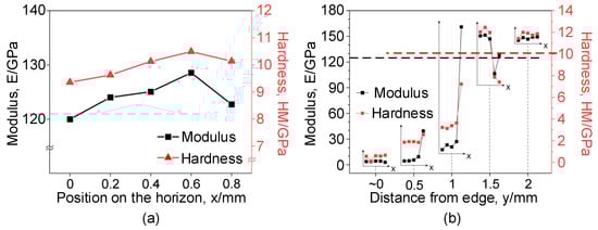 The re-solidification at the edge of the W-EDM-processed sample leads to changes in the mechanical properties of the metal material. The elastic modulus and hardness of the samples at different positions can be measured by nano-indentation, as shown in Figure 11.