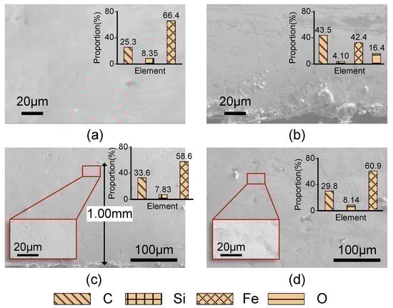 Furthermore, the EDS results of the original ribbons are shown in the insets in the upper-right corner of Figure 12d. It is shown that the surface contains about 25.3 at.% C, 8.35 at.% Si, and 66.35 at.% Fe. After W-EDM processing, the elemental composition in the affected area near the edge changed greatly. However, as the distance from the edge increases, the composition of the unaffected area converges to that of the original ribbon.