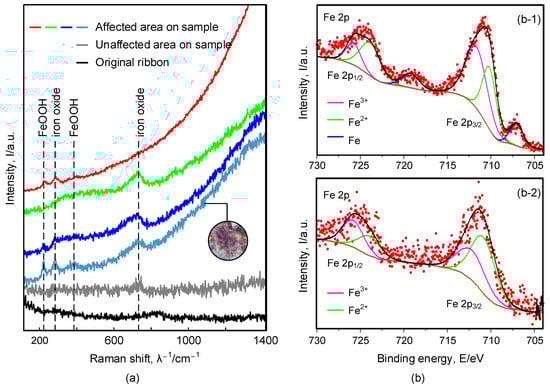 The composition of the processed samples characterized by Raman spectroscopy is shown in Figure 13a. The spectrum shows that iron (III) oxide and iron hydroxide oxide exist on the surface of the sample in the affected area caused by W-EDM processing. Likewise, the XPS spectra also confirm the changes in the composition on the processed sample surface, as shown in Figure 13b. Figure 13(b-1) is the XPS spectrum of the original ribbon, showing the existence of iron (binding energies of 707.1 eV). Figure 13(b-2) shows the state of iron at the edge of the W-EDM-processed sample. The binding energies of Fe and Fe in the 2p 3/2 and 2p 1/2 energy levels are 710.8, 712.2 eV and 724.0, 725.0 eV, respectively, [33], which are all reflected in the XPS spectrum.