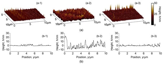 The surface profile of the samples before and after W-EDM processing was further observed by AFM, as shown in Figure 14a. Figure 14(a-1–a-3) display the surface profiles of the original ribbon, the W-EDM-processed edge, and the unaffected area on the processed sample, respectively. Their average surface roughness was 2.03, 4.68, and 1.57 nm, respectively. Figure 14b shows the height distribution at different locations, and corresponds to Figure 14a, where the abscissa is the vertical direction (i.e., perpendicular to the W-EDM-processing edge). It is obvious that the height variation on the edge region of the processed sample is more in-homogeneous.