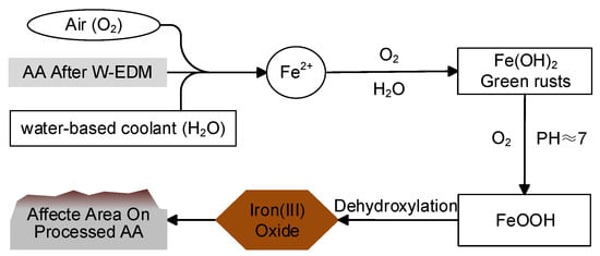 During the W-EDM processing, the water-based coolant is sprayed intermittently onto the workpiece around the molybdenum wire to cool the high temperatures generated by the electric spark. The coolant forms a liquid film at the processing edge of the AA ribbon due to the unevenness caused by the W-EDM erosion. The iron in AA, the water-based coolant, and the oxygen-enriched air environment constitute the galvanic reaction. On the surface of the AA ribbon, Fe ions are continuously precipitated into the liquid film to form Fe(OH) and its hydrate. The ferric hydroxide reacts with oxygen in the collet of neutral or weak-alkali to form a precipitate mainly composed of ferric oxyhydroxide. Ferric oxyhydroxide undergoes further dehydration reactions to form iron (III) oxide [34]. However, for the unaffected area on the W-EDM-processed AA ribbon, the surface is relatively smooth, which makes it difficult for the coolant to remain. At the same time, the oxidation protection layer on the original surface is not damaged by erosion. Therefore, electrochemical corrosion is difficult to occur, so the unaffected area basically maintains the same morphology and performance as the original ribbon. The above process is shown in Figure 15.