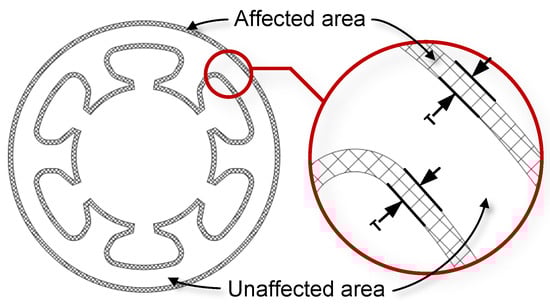 Based on the loss deterioration mechanism of W-EDM-processed AA ribbons, a modified loss model of processed AAs suitable for engineering calculation was established. As shown in Figure 16, the loss calculation area is divided according to the W-EDM-processing-affected area. Therefore, the loss, , calculation of the AAs were revised as Equation (2).