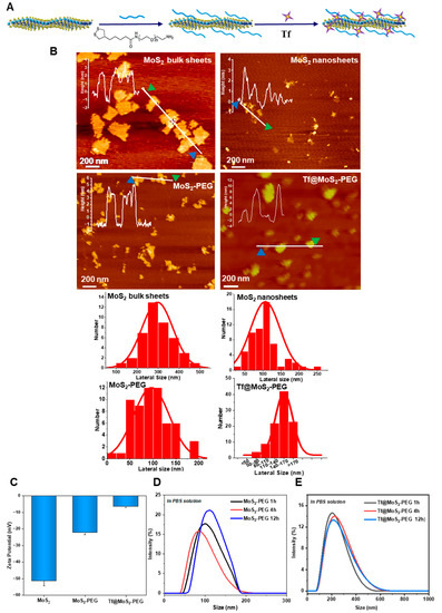 Figure 1. (A) Schematic illustration of the synthesis of Tf@MoS2-PEG nanosheets. (B) AFM images of MoS2 bulk sheets before ultrasonication, MoS2 nanosheets, MoS2-PEG, and Tf@MoS2-PEG nanosheets. The insert figures indicate the height measurements along with the line profiles. The histograms show the lateral size distribution of MoS2 bulk sheets, MoS2 nanosheets, MoS2-PEG, and Tf@MoS2-PEG NSs. (C) Zeta potential of MoS2, MoS2-PEG, and Tf@MoS2-PEG in deionized water. The hydrodynamic diameters of MoS2-PEG (D) and Tf@ MoS2-PEG (E) in PBS solution.