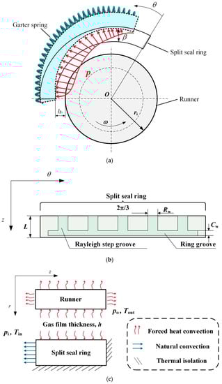 Schematic diagram of split floating ring seal structure and heat transfer boundary []. (a) Split floating ring seal structure; (b) Schematic diagram of Rayleigh step groove structure; (c) Boundary conditions.