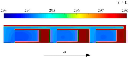 Film temperature distribution obtained by present model for the reference split floating ring seal with pocket depth 10 μm []. (pi = 0.1 MPa, po = 0.6 MPa, ω = 1000 s−1, Tin = 293 K, Tout = 293 K).