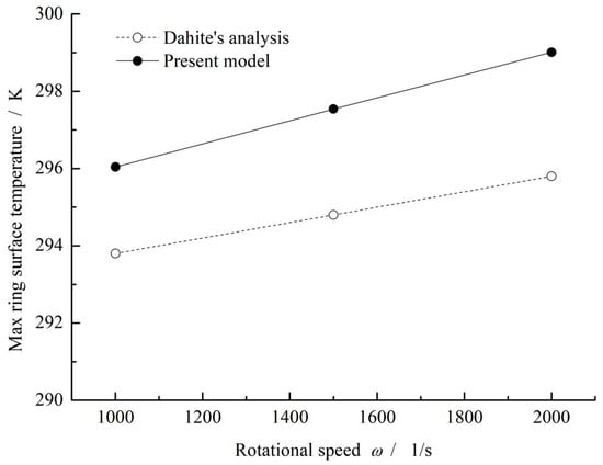 Further, the max ring surface temperature calculated by the present model is also compared with the reference, as shown in Figure 3. It can be seen that the max ring surface temperature increases from about 296 K to 299 K with increasing rotational speed from 1000 s−1 to 2000 s−1. As a whole, the theoretical results of the present model are in good agreement with Dahite’s work.