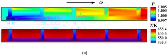 Figure 4 shows the pressure and temperature distribution of the split floating ring seal film. It can be seen that the deflection angle and surface groove have an obvious influence on the pressure distribution and temperature. For the sealing pressure distribution, under the working conditions of seal pressure pi = 0.1 MPa and rotational speed ω = 3.0 104 r/min, the ring deflection forms a wedge convergence gap, which causes significant dynamic pressure effect along the direction of rotational rotation. When the deflection angle β increases from 0 rad to 20 × 10−6 rad, the maximum film pressure increases from 0.1005 MPa to 0.15 MPa, while the maximum film temperature decreases from 658.4 K to 635.1 K.