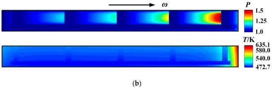 Pressure distribution and temperature distribution of split floating ring seal. (a) β = 0 rad; (b) β = 20 × 10−6 rad (pi = 0.1 MPa, ω = 3.0 104 r/min, Tin = 580 K, Tout = 380 K, β = 0/2e−5 rad).
