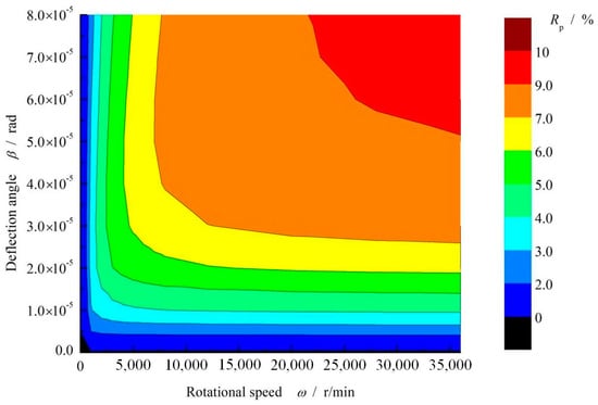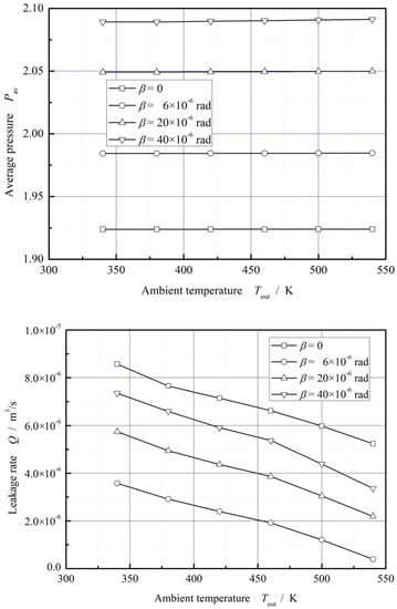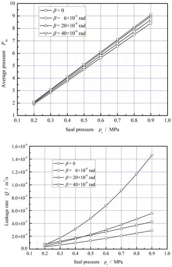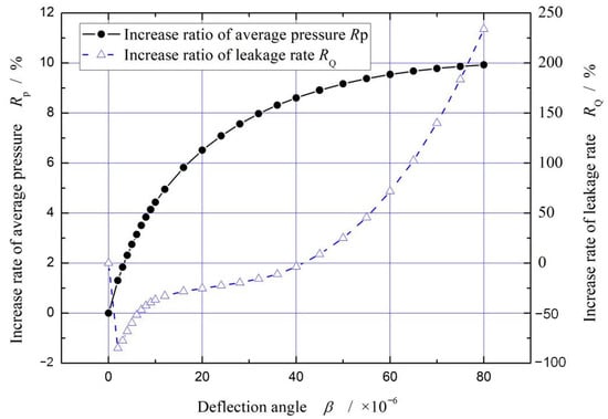 Figure 5 illustrates the influence of deflection angles on increase rate of average pressure and increase rate of leakage rate. As shown in this figure, when the deflection angle increases from 0 to 80 × 10−6 rad, increase rate of average pressure increases rapidly, from 0 to about 10%. As a whole, the increase rate of leakage increases continuously with the increase of deflection angle, reaching a maximum value about 240%, except for decrease not exceeding about 84.8% when β < 4.5 × 10−6 rad.