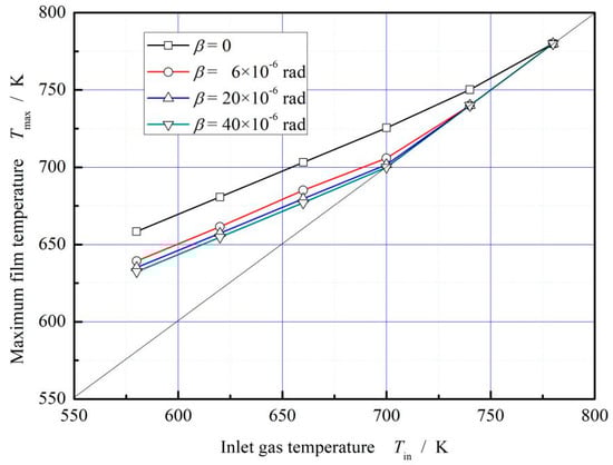 Influence of deflection angle on the maximum film temperature. (pi = 0.2 MPa, ω = 3.0 104 r/min, Tout = 380 K).
