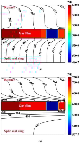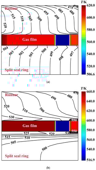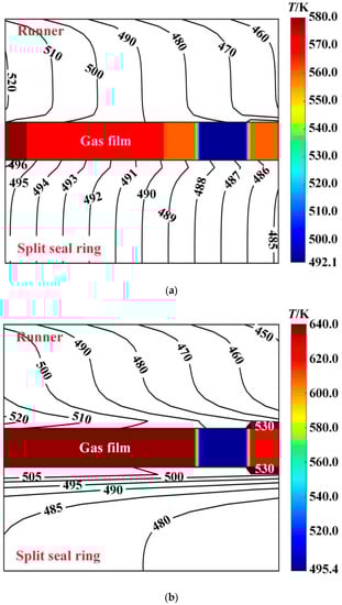 Figure 13 shows the temperature distribution of the center profile of sealing friction pair at different deflection angles. It is shown that the gas film temperature decreases along the high-pressure side and low-pressure side due to the gas expansion and heat absorption. When the deflection angle increases from 0 to 60 10−6 rad, the maximum film temperature decreases from 640.0 K to 580.0 K, with a decrease of about 12.5%. The runner temperature change is not obvious, while the seal ring temperature is reduced from 530.0 K to 496.0 K, a decrease of about 6.4%.