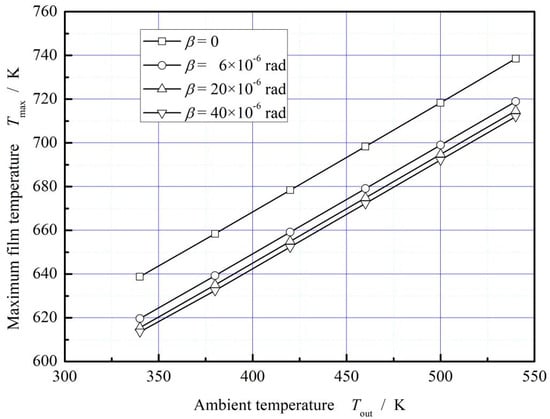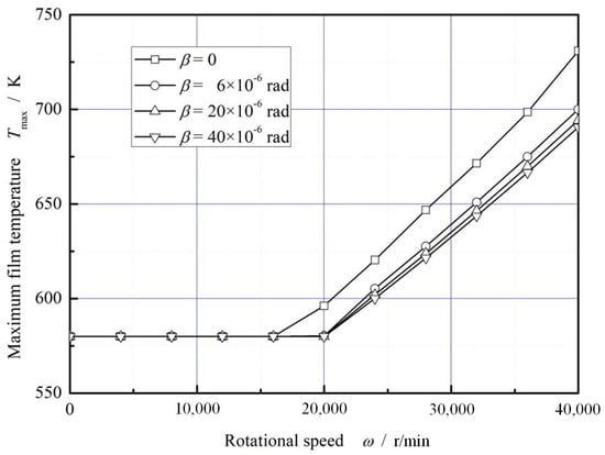 Influence of rotation speed on the maximum temperature of gas film. (a) β = 6 × 10−6 rad; (b) β = 0; (pi = 0.2 MPa, ω = 3.0 104 r/min, Tin = 580 K, Tout = 380 K).