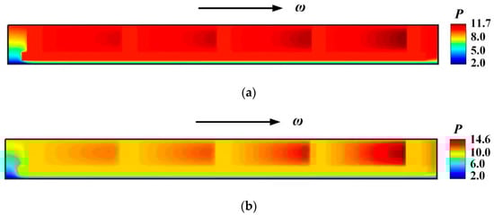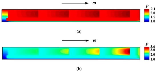 Pressure distribution at different deflection angles. (pi = 1.0 MPa, ω = 3.0 104 r/min, Tin = 580 K, Tout = 380 K). (a) β = 6 × 10−6 rad; (b) β = 20 × 10−6 rad.