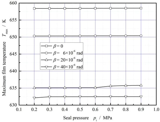 Figure 14 plots the influence of seal pressure on maximum film temperature. With the increase of the seal pressure, the maximum film temperature presents no obvious variation. Compared with the absence of ring deflection, the increase of ring deflection angle has a significant decreasing trend on the maximum temperature of the film, and the maximum cooling range is about 4.3%.