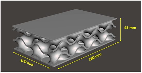 Figure 1 presents the designed 3D porous bridge bearing model using several gyroid cellular structures. Gyroid surface is one of the most used triply periodic minimal surfaces for many applications, which offers a relatively high performance to weight ratio under any loading, especially for stiffness. There are numerous ways to generate a structure model such as parametric generation based on atomic units and implicit surface extraction construction. In this paper, the parametric generation approach has been selected for creating the proposed model using CAD software due to its easy modification, instant design as well as better resolution. The model dimensions are based on the design of common bridge bearings used for Thailand highway bridges [30]. The model consists of two layers with a 50 mm unit cell size and a 2 mm thickness. The gyroid geometry is based on the following equation.