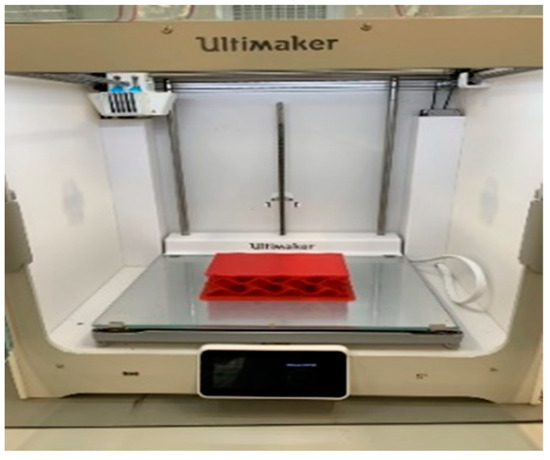 The specimen materials are stainless steel and thermoplastic polyurethane (TPU) considered as the mass and spring, respectively (indicated in Figure 2). The fused deposition modeling (FDM) 3D Printing technique is selected for producing the bearing specimens, which needs the features of a University of Birmingham’s Ultimaker 3D printer, shown in Figure 3. The TPU material is chosen due to its rubber-like properties [31,32,33,34] and manufacturing ability in the market. Table 1 provides the physical and mechanical properties of stainless steel and thermoplastic polyurethane (TPU) considered as the mass and spring.