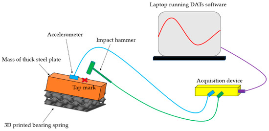 The record data for analyses in a short time is performed using an acquisition device connected to a laptop. It is important to mention that the idealised concept for lightweight TPMS bridge bearing testing is considered as a lumped mass model (single degree of freedom, SDOF). This can potentially enable the test setup to obtain the direct vicinity of the resonant peak. Regarding the SDOF idealisation of the system, the use of an accelerometer is conducted to measure the response at the middle point with at least 3 hit times and then a range of FRFs obtained are extracted to acquire the natural frequencies and the mode shapes using modal analysis software (DATs).