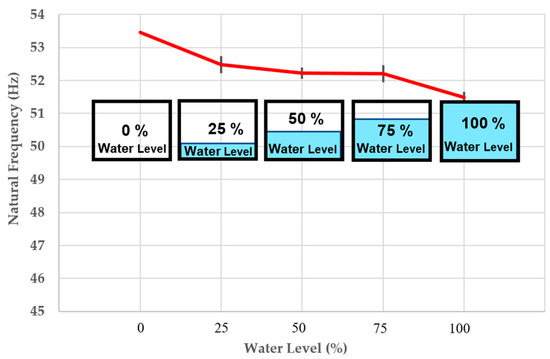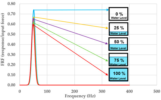 It is obvious that the FRFs are affected by the water level as seen in Figure 13. The trend of the FRFs is decreasing with increasing the flood level. When the flood level is completely full, its natural frequency significantly changed compared to that of the initial state. Referring to Equation (6), if the natural frequency changes, the stiffness also alters, as the mass is assumed to be constant. It is important to note that this paper only focuses on the peaks of natural frequencies of the proposed bearing’s vibration system rather than considering the noise.