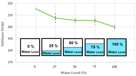 As such the natural frequency decreases when the flood level increases, and the stiffness also decreases as presented in Figure 15. As previously mentioned, the trend of the system’s stiffness is identical to that of natural frequency, but the different values of the modal parameter. This is because the stiffness of the vibration system is proportional to the natural frequency according to Equation (6), and the mass does not affect the relationship between the stiffness and natural frequency of system. The average stiffness continues to lower, compared to the dry condition, and is also nearly 7.5% less than that under dry condition.