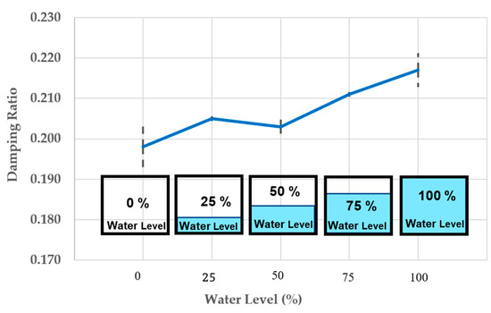 Figure 14 shows the change of the 3D-printed porous bridge bearing system’s natural frequencies, indicating that there is a dramatic change (a considerable jump, 3.7% lower) after full flood level, but the rest of frequencies of the vibration systems with increasing water level from 0% to 100% (every 25%) is almost unchanged. The reason causing the significant jump is that the lower surface of the steel plate’s mass was likely to come into contact with flood water, resulting in the unusual change of the system’s natural frequency. The overall trend of natural frequency change is decreasing with the increasing water level. Note that, all the three following curves (natural frequency, stiffness, and damping) providing average values are also plotted to compare with standard deviation (gray dash lines in y-axial direction).