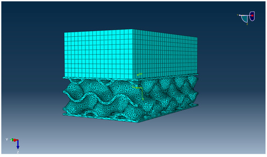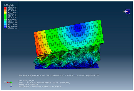 According to the experimental results, in this section the development of a 3D-printed gyroid bridge bearing has been proposed and validated against the experimental data in the following section. Figure 17 shows the whole finite element (FA) model consisting of the proposed bearing model and the thick steel plate model considered as a lump mass. The dimensions of both the plate and bearing models are the same as the specimen. Moreover, their material model properties are provided in Table 1. Regarding the mesh generation of both the models, the proposed bearing and the thick steel plate models are discretised with 3D mesh composed of 173,457 ten-node first-order tetrahedral solid elements (C3D10) and 6120 eight-node reduced integration first-order brick elements (C3D8R), respectively. As the consideration of the free vibration of an undamped SDOF system of the proposed bearing on a ground, the lowest mode corresponding to the vertical translation is the same manner in the tests, occuring at a natural frequency of 65 Hz. Alternatively, Equation (6) in Section 3.3 is used to calculate its natural frequency, involving the static parameters such as stiffness and mass. This is becasuse the dynamic model of the proposed bearing requires the static stiffness of material at frequency equal to zero. It is also worth noting that the stiffness of the bearing specimen is assumed within its elastic range. Subsequently, a compariosn of the natural frequencies between the predictions and measurements is conducted in the following section. For the cabrilation of the model under flood conditions, the model will be based on the variations in the damping ratio corresponding to the flood levels, which are obtained from the measurements.