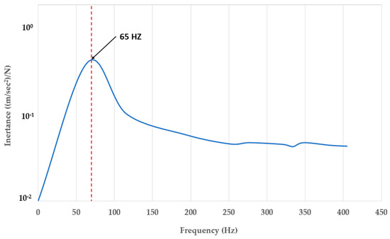 The experimental measurements derived from the modal testing of a thick steel plate over the proposed 3D-printed porous TPU bridge bearing are indicated in Figure 12 and Figure 13. Note that the most possible method to test the proposed 3D-printed TPU bearing is that of using the hammer excitation in vertical direction perpendicular to its top surface, due to the complex geometry and very lightweight. Furthermore, the main load that bearing basically support the superstructure weight of a bridge is applied in that direction before continuing resisting horizonal loads or others.