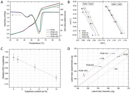 DSC analysis of paraffin- (PCM) and graphene-based composites: (A) heat flow curves vs. temperature and the corresponding accumulated heat recorded under 80 mL min−1 nitrogen flow, at a heating rate of 10 °C min−1; (B) graphic representation vs. , where the slope of the line resulting from linear fitting is proportional to the activation energy according to the Kissinger equation; (C) relative DSC crystallinity dependence on the graphene content; (D) latent heat evaluated by integrating the corresponding peak on the DSC curves in (A) compared to the theoretically estimated values.