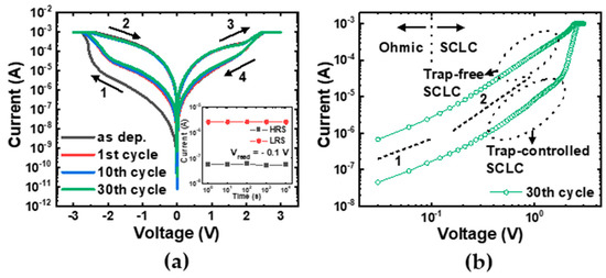 (a) The I–V characteristics of the fabricated Al/αTiOx/Al interfacial RRAM devices for the initial and 30 cycles. The arrows indicate the direction of the voltage sweep. The inset shows the retention characteristics. (b) The double-logarithmic plot of the I–V curve at the 30th cycle.