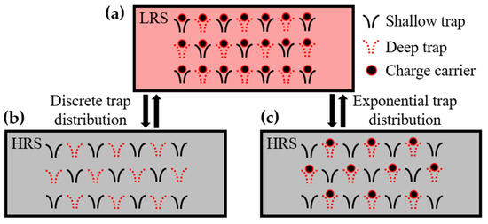 Based on these results, we propose a mechanism for the endurance degradation in Al/αTiOx/Al interfacial RRAM devices as shown in Figure 4. When assuming a discrete trap distribution, the process of filling/emptying all traps is repeated during the RS cycle, as shown in Figure 4a,b, and no RS degradation occurs. However, when assuming exponential trap distribution, the deep traps filled with electrons during the set process do not release electrons during the reset process (Figure 4c), consequently reducing the resistance at the HRS. Our understanding of the RS degradation mechanism can be well supported by subsequent LFN measurements. This is because the change in the trap density is directly related to the noise level [45,46].